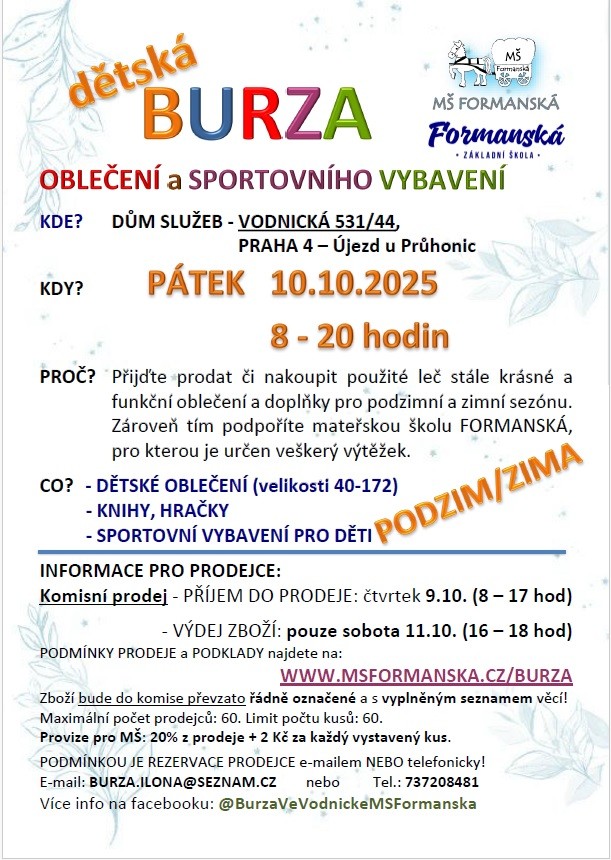 Dětská burza podzimního a zimního oblečení a sportovního vybavení se bude konat ve společenském sále domu služeb, ulice Vodnická 531/44, v pátek 10. října 2025 od 8.00 do 20.00 hodin.