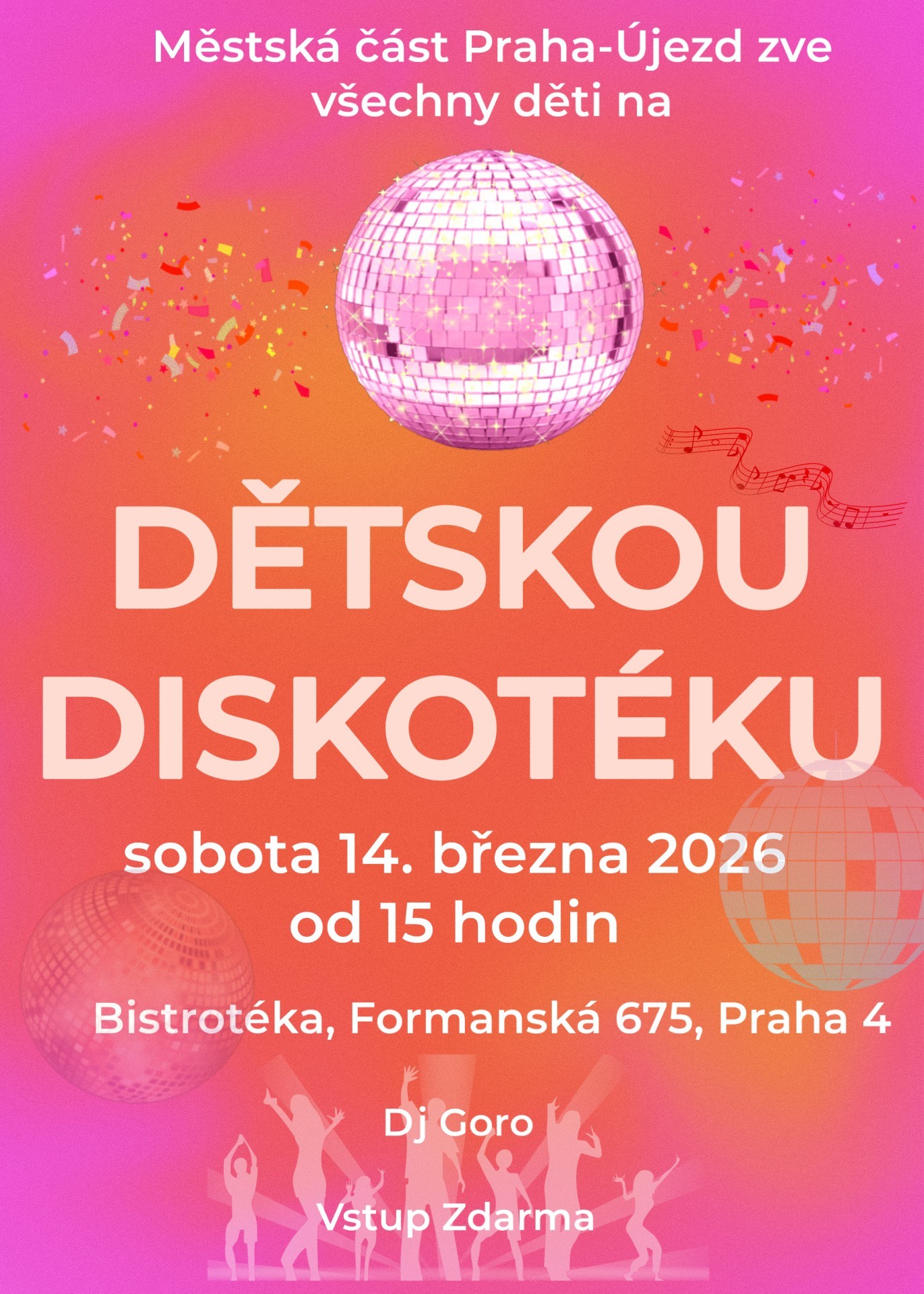 Diskotéka pro dětiDatum konání: 14.3.2026 Zveřejněno: 4. 3. 2026 autor: pavla.pitrmanova Zveme všechny děti v sobotu 14. března na diskotéku. Začínat budeme v 15.00 hodin v Bistrotéce, ulice Formanská 675. Přílohy # Soubor Velikost souboru 1 Pozvánka na diskotéku 574 KB