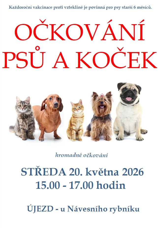 Očkování proti vztekliněDatum konání: 20.5.2026 Zveřejněno: 2. 4. 20261. 4. 2026 autor: pavla.pitrmanova Očkování psů a koček proti vzteklině proběhne v Újezdu u Návesního rybníka od 15.00 do 17.00 hodin. Přílohy # Soubor Velikost souboru 1 Očkování psů a koček proti vzteklině 103 KB