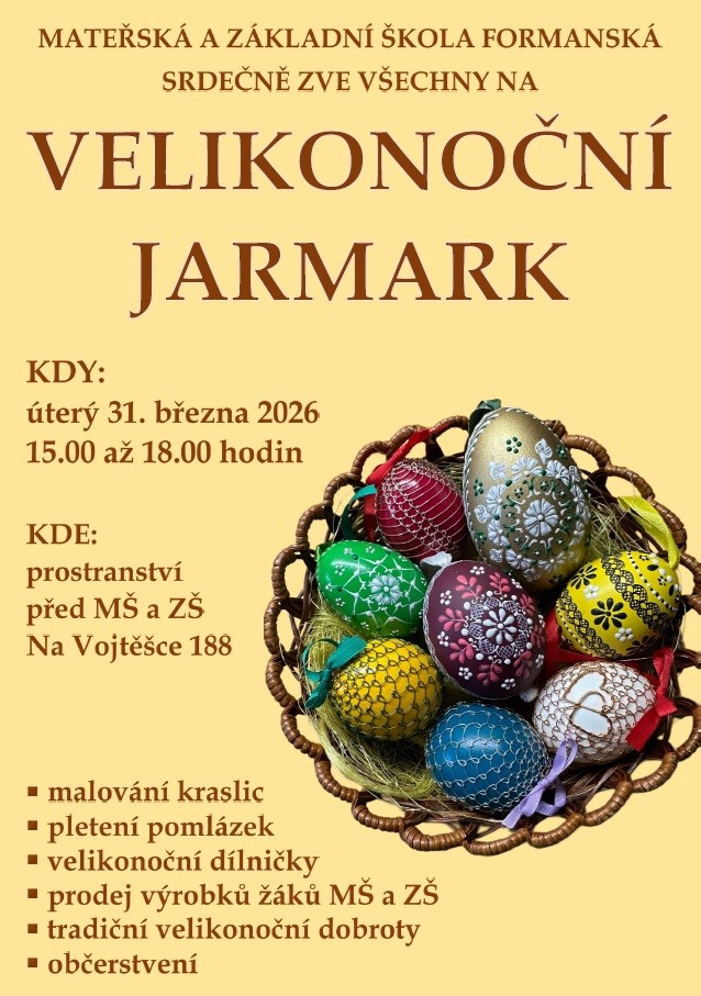 V mateřské a základní škole Formanská proběhne v úterý 31. března 2026 od 15.00 hodin velikonoční jarmark.