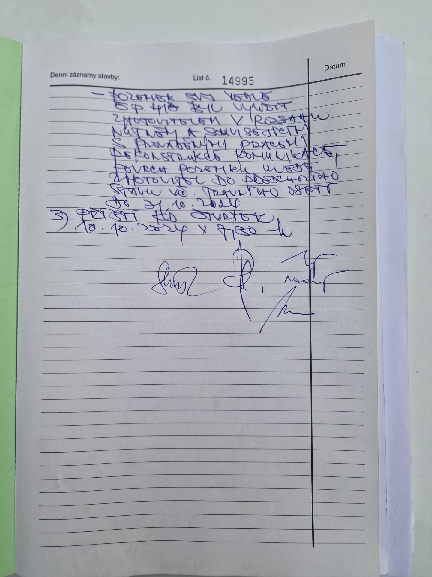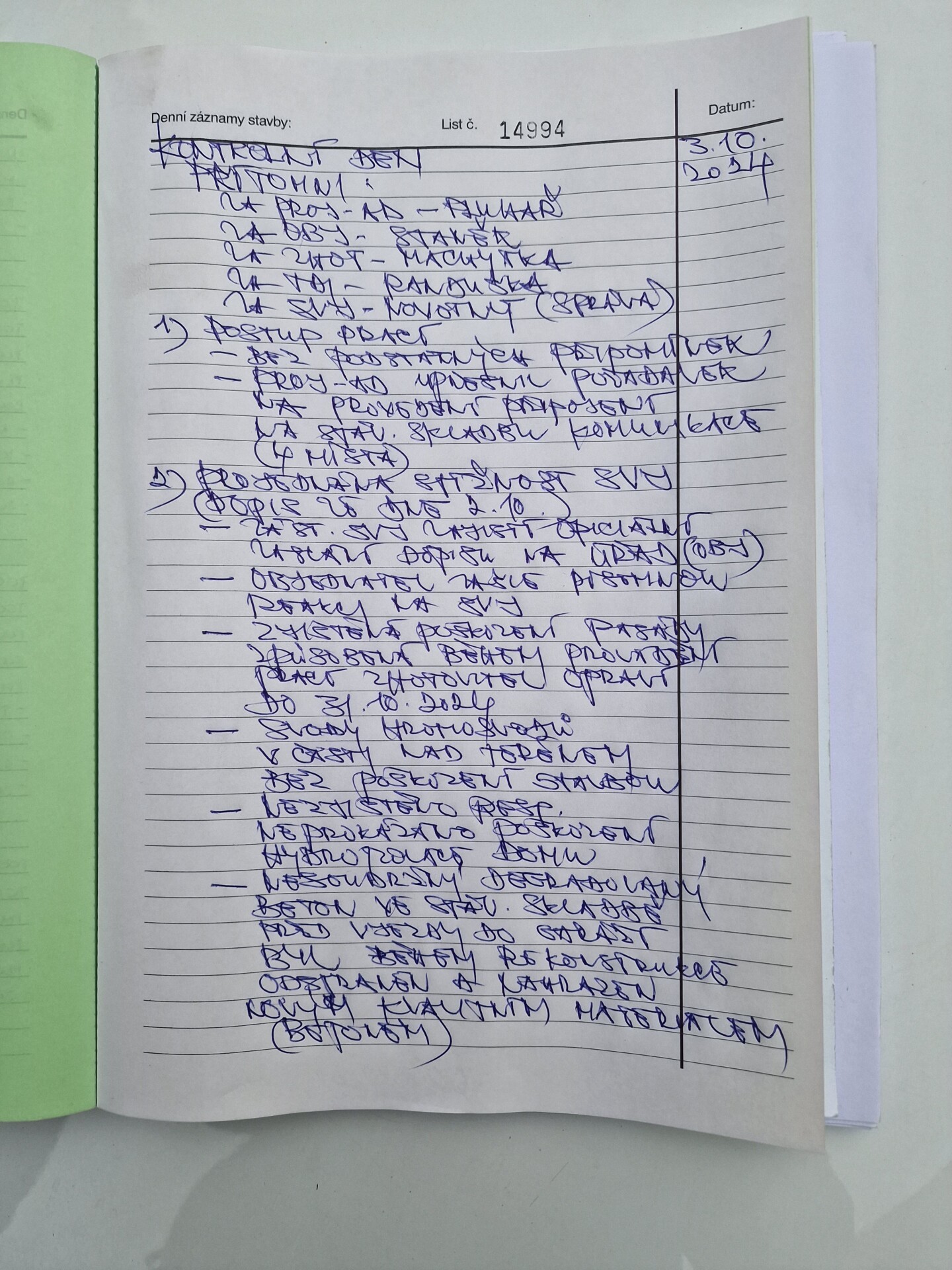 – Zápis ze stavebního deníku I, Zápis ze stavebního deníku II - Sdělení pana Pitrmana ve věci poškození hromosvodu a sdělení jména osoby zastupující MČ Praha-Újezd, kterému byla informace předána