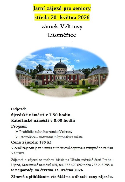 Letošní jarní zájezd je naplánován na středu 20. května 2026, kdy senioři navštíví zámek Veltrusy a město Litoměřice. Cena zájezdu je 180 Kč. Zájemci se mohou přihlašovat na tel. č. 272 690 692 nejpozději do 14. května 2026.