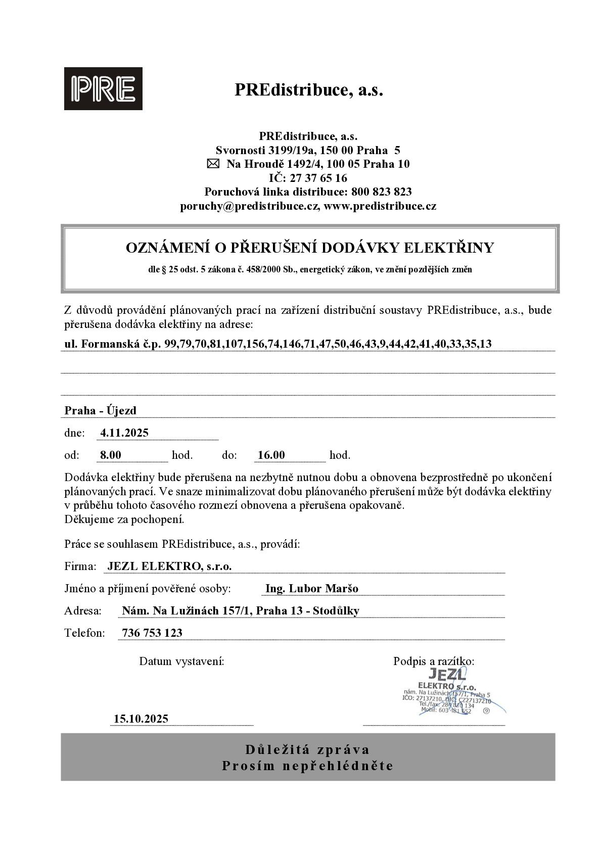 Z důvodu provádění plánovaných prací na zařízení soustavy PREdistribuce bude přerušena dodávka elektřiny v úterý 4. listopadu 2025 od 8.00 do 16.00 hodin v ulici Formanská č.p. 99, 79, 70, 81, 107, 156, 74, 146, 71, 47, 50, 46, 43, 9, 44, 42, 41, 40, 33, 35, 13.
