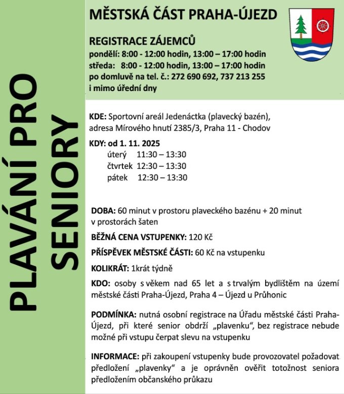 Na říjnovém zasedání zastupitelstva bylo schváleno poskytnutí doplatku ve výši 60 Kč k ceně vstupného do plaveckého bazénu ve Sportovním areálu Jedenáctka. Od 1. listopadu již přihlášení senioři plnohodnotně využívají zvýhodněné vstupy do bazénu. V případě zájmu je možné se dodatečně přihlásit a začít využívat zvýhodněné vstupné. Podmínkou je trvalý pobyt v městské části, věk 65 let a vyšší a registrace na úřadu. Zvýhodněné vstupné se uplatňuje na základě předložení plavenky, kterou senioři obdrží při registraci na úřadu. Více informací obdržíte na tel. č. 272 690 692.