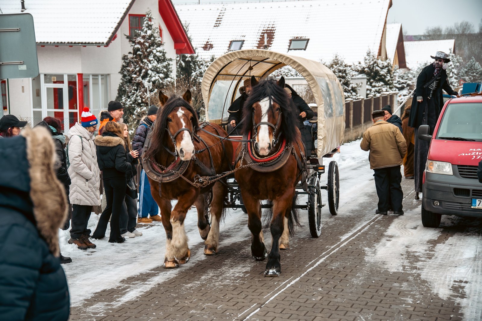 Průvod doprovázelo koňské spřežení s hudebníky a nechyběl ani traktor s valníkem pro děti. Do programu se zapojil Aleš Bílek se svými maskami, k vidění byl také Smrťák na chůdách a vystoupila dechová kapela. Ulicemi prošlo množství nápaditých masek všech věkových kategorií.