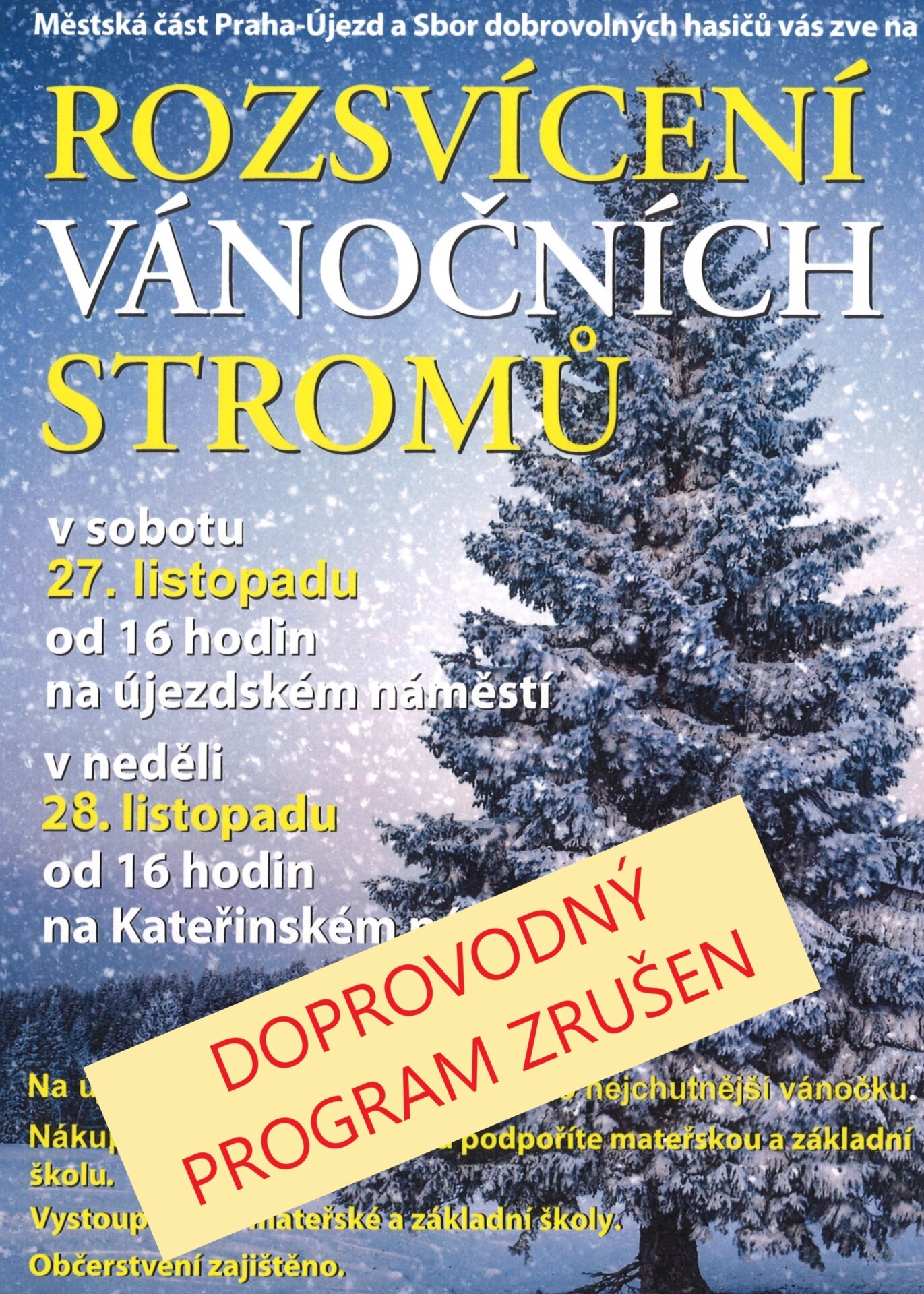 Vážení spoluobčané, bohužel vám musíme oznámit, že z důvodu aktuální epidemické situace bude zrušen doprovodný program u rozsvěcení vánočních stromů na újezdském a Kateřinském náměstí.