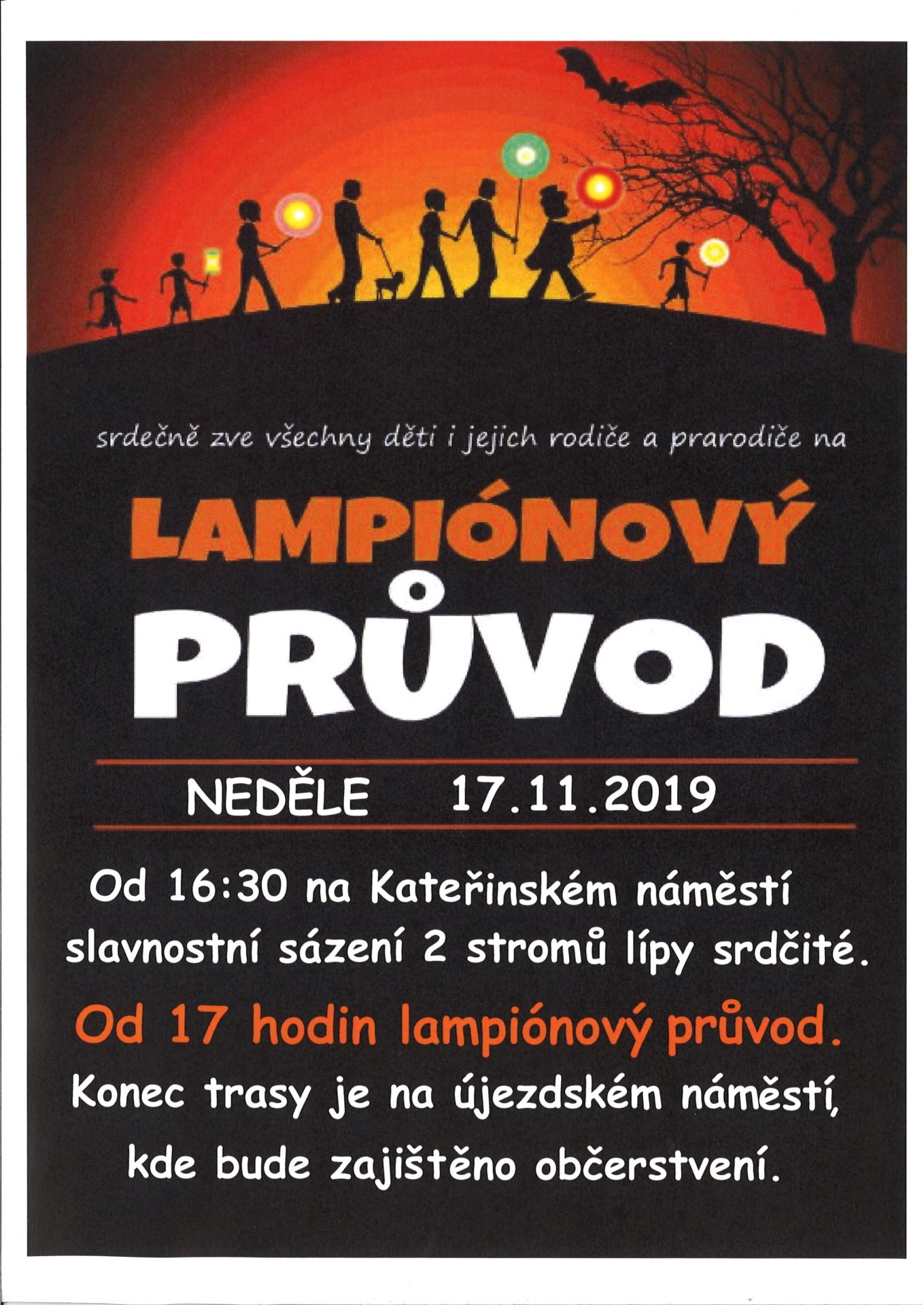 U příležitosti 30. výročí sametové revoluce budou v 16.30 hodin vysázeny dva stromy lípy srdčité. V 17.00 hodin vyjde lampionový průvod směrem na újezdské náměstí. Lampiony s sebou!