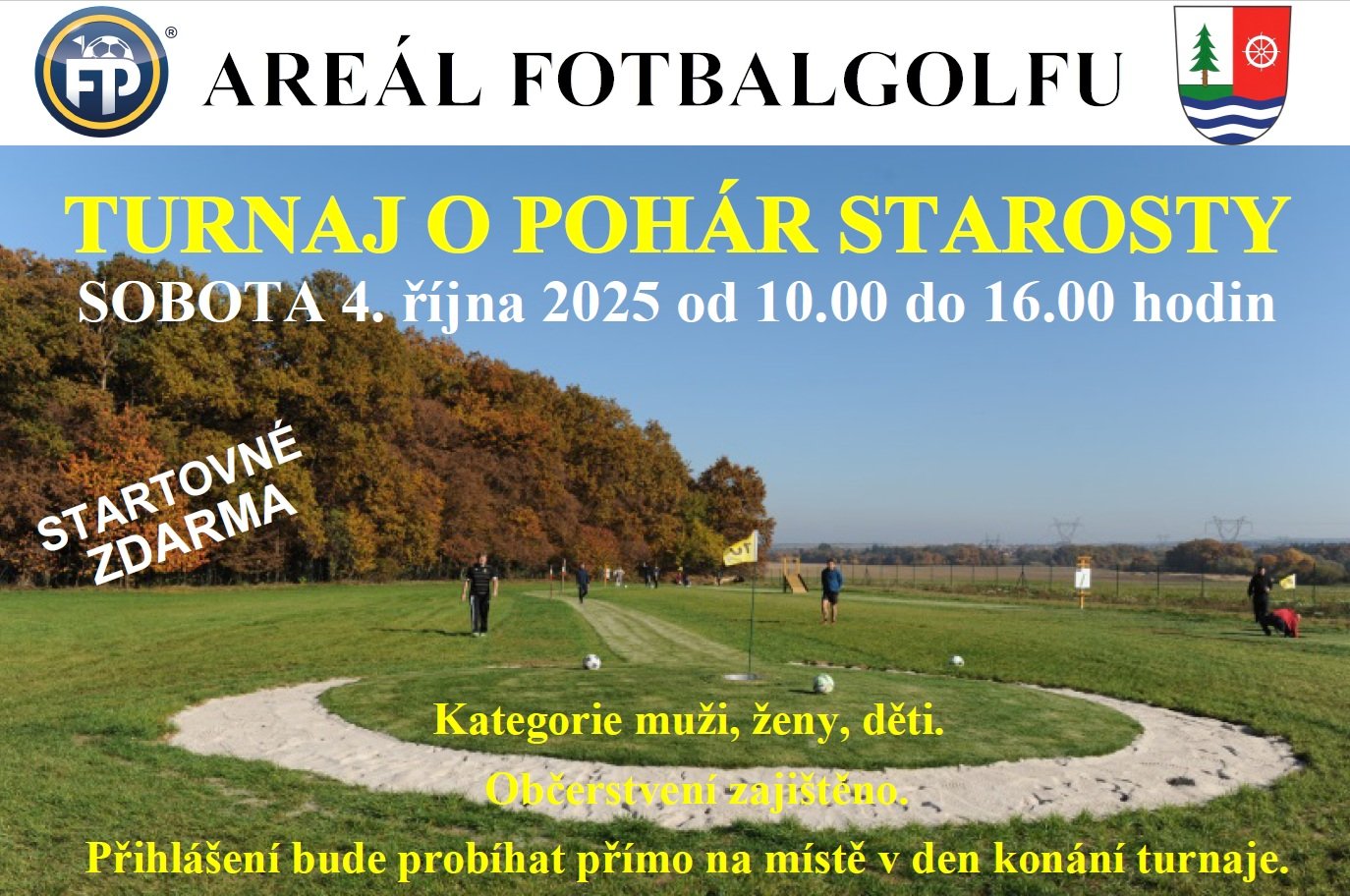 Všechny srdečně zveme na turnaj o pohár starosty ve fotbalgolfu, který se bude konat v sobotu 4. října 2025 od 10 do 16 hodin v kategoriích muži, ženy a děti. Pro všechny je startovné zdarma. Přihlášení bude probíhat přímo na místě v den konání turnaje.